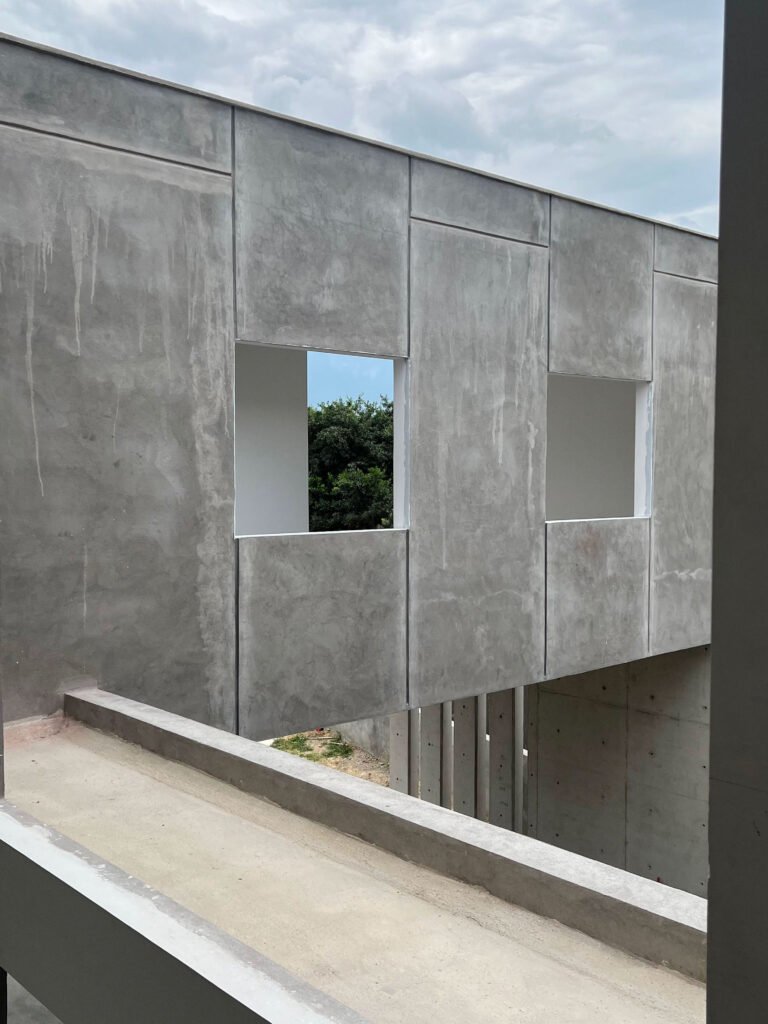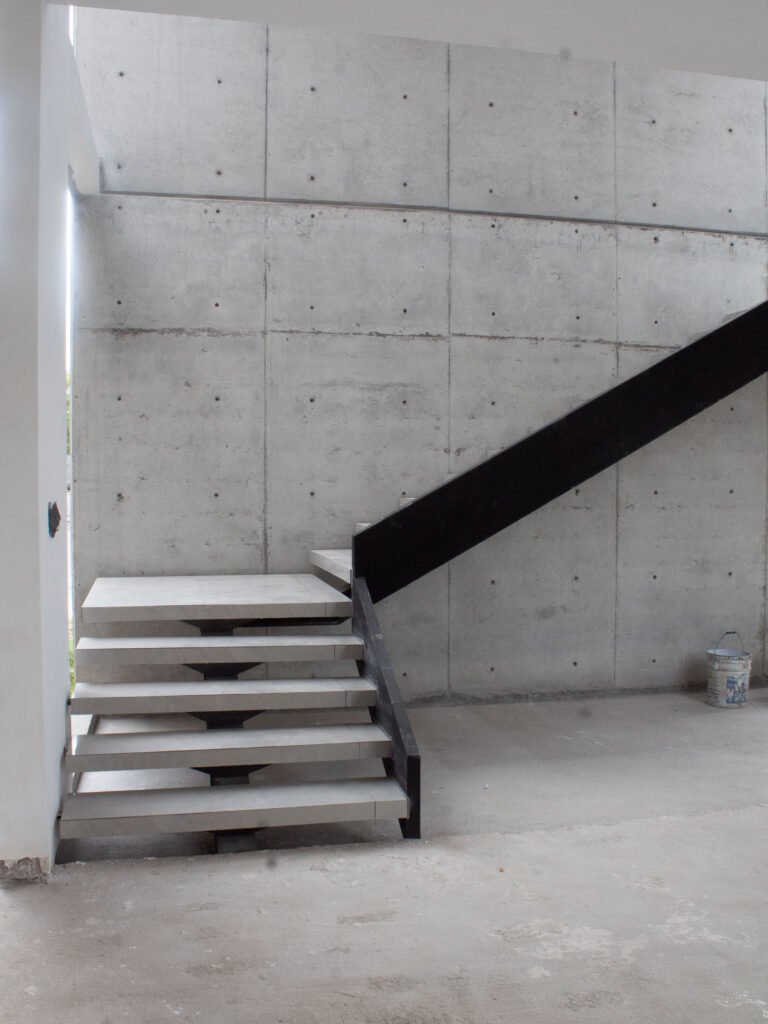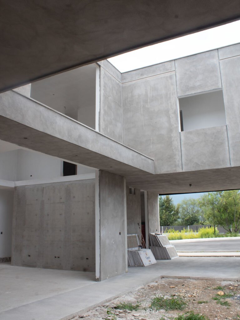 Esta residencia de 460 m² de construcción destaca por una composición arquitectónica basada en mármol seccionado, concreto aparente y volúmenes limpios.